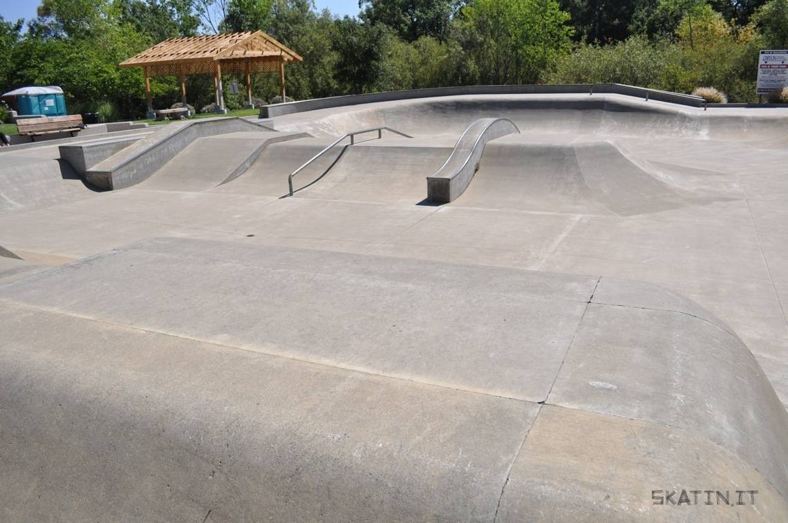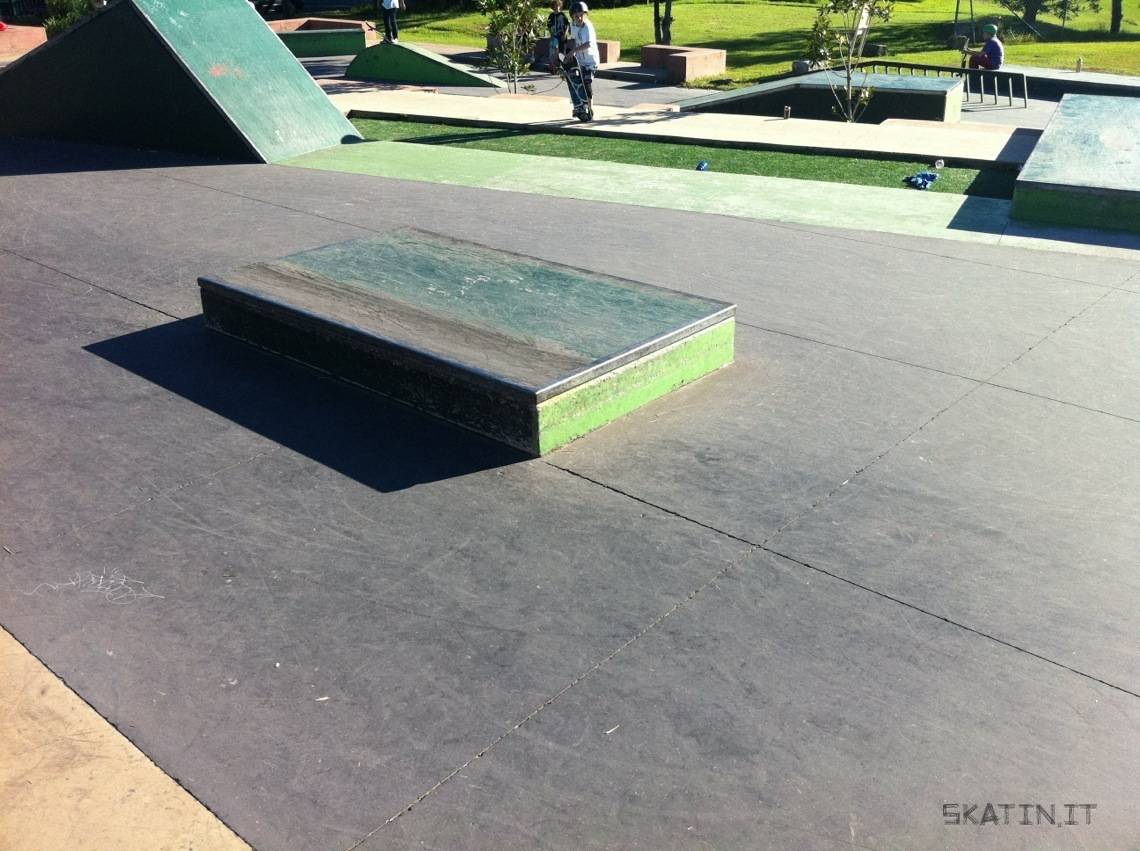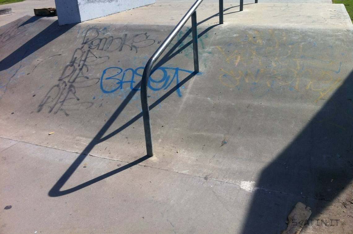 Cement pre-fab skatepark with a decent variety of quarters, banks, pyramid-boxes, fun-boxes and rails. A few of the quarters have coping and range in size from 4-6 feet. For one of these pre-fab parks it has a much wider range than usual and the’s a good run that you can do around the outside perimeter thats especially good for younger skaters who are learning drop-in’s or roll-in’s and getting used to going fast. But to be honest there is more than enough here for seasoned skaters too, well thought out placement of the fun-boxes and rails mean you can really get some great runs happening. All the cement surfaces are in good condition but the is some wear around the coping on a few of the quarters.