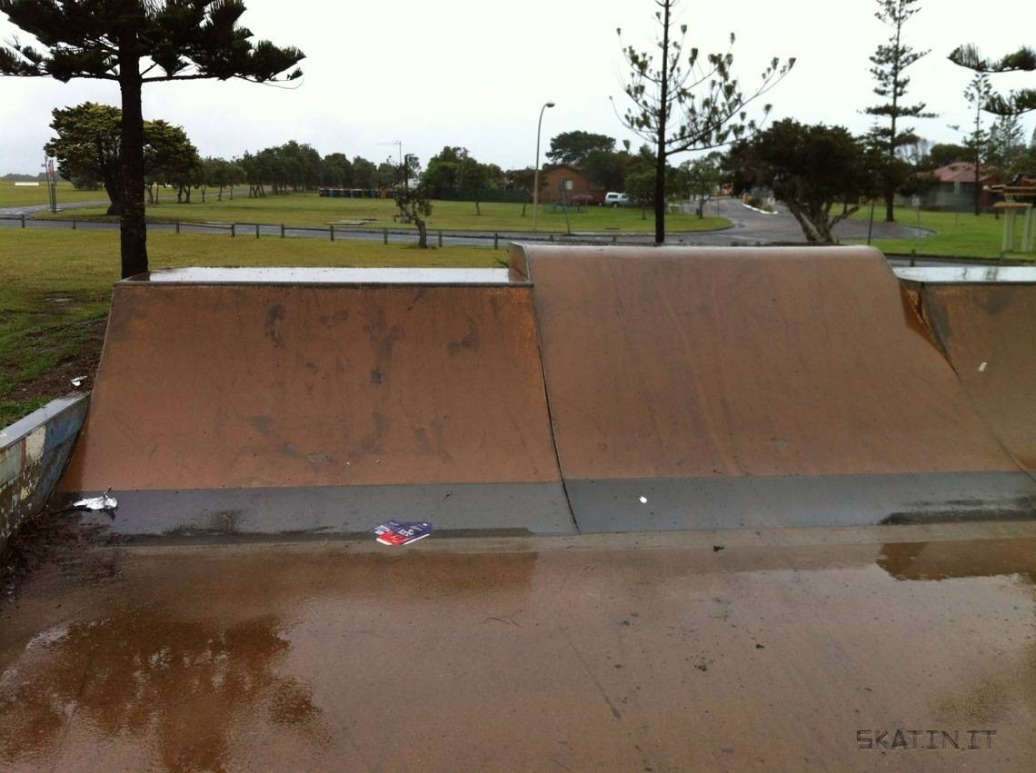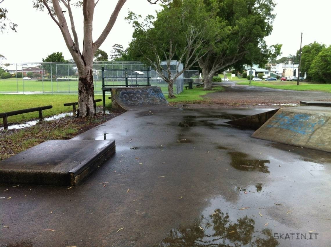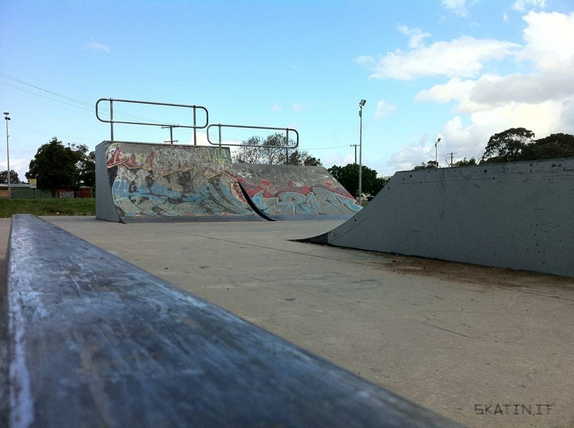Metford Skatepark is another suburban pre-fab affair. A bank of 4.5ft quarters at each end (some with coping, some simply roll-ins) and a central funbox with an elevated slide rail. The surface is pretty rough and it’s filled with debri from the surrounding trees and the coping is almost cute! As we’ve seen again and again these kind of skateparks were an easy way for local Hunter Valley councils to get something up quickly and cheaply. They’re all slightly different but are based on the same concept and you can usually have a reasonable session… you’d probably just never go back.