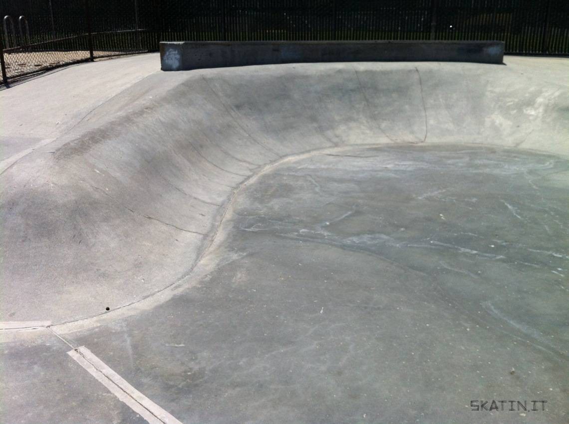 Bowl: Trusty old school style cement pool with two levels. The shallow end starts at 6ft with a quick transition. The and deep end sinks to around 10ft. The coping matches the pool style roots and the surface is blisteringly fast. A solid skate.