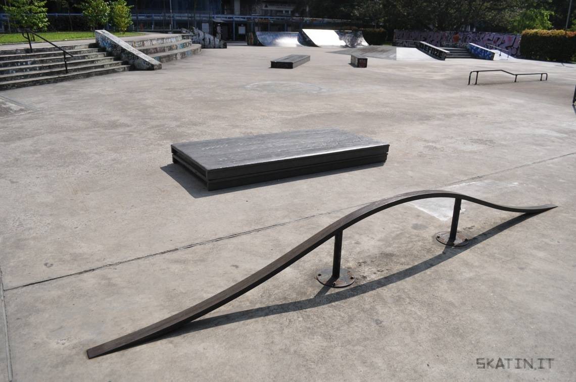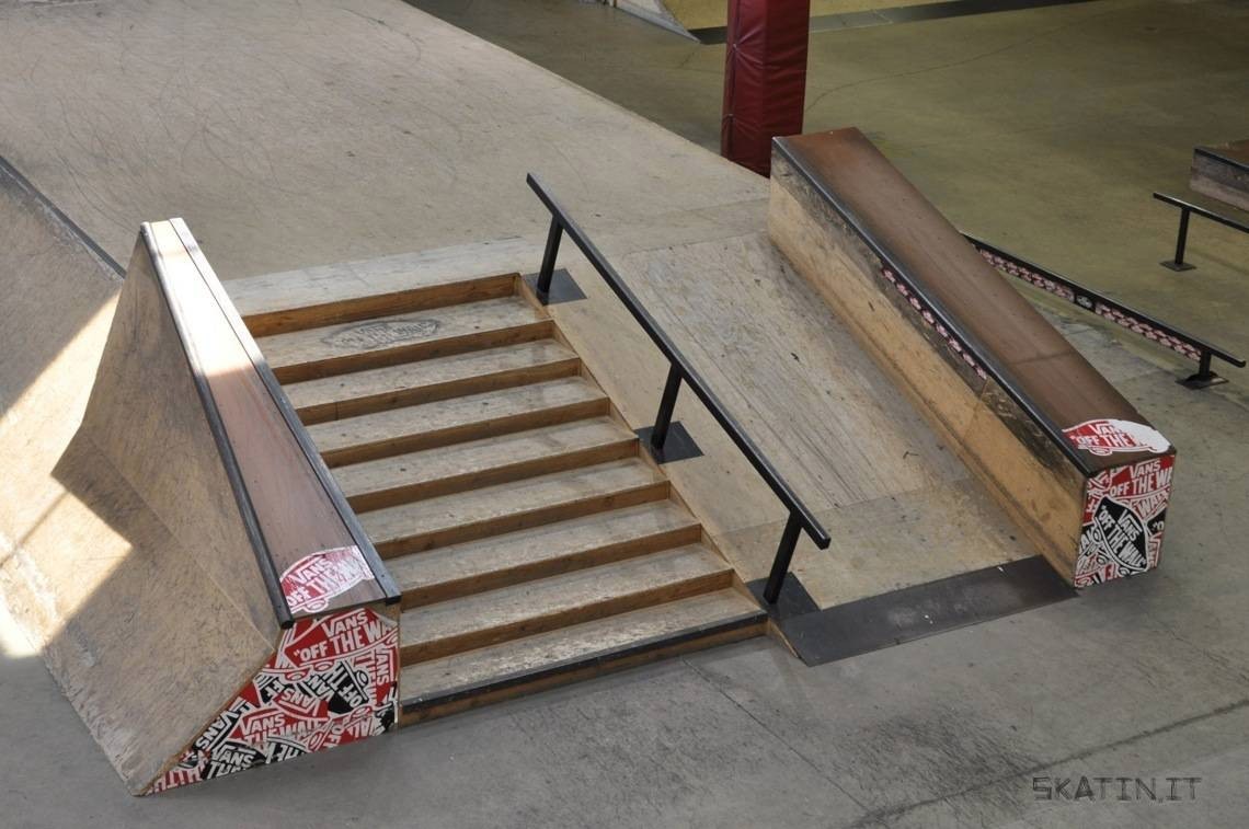 2-3ft high slide boxes that run from 20-30ft long to monstrous hubba’s that scale 20 stairs. Surrounding the main collasium is a stack of 4ft banks and transitions in all kinds of shapes, some with an extra foot or two of extension. And there’s rails and boxes everywhere,