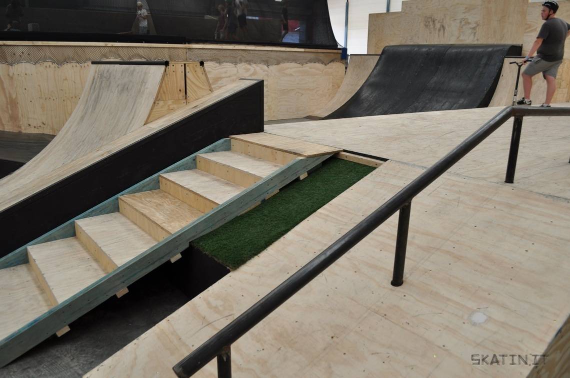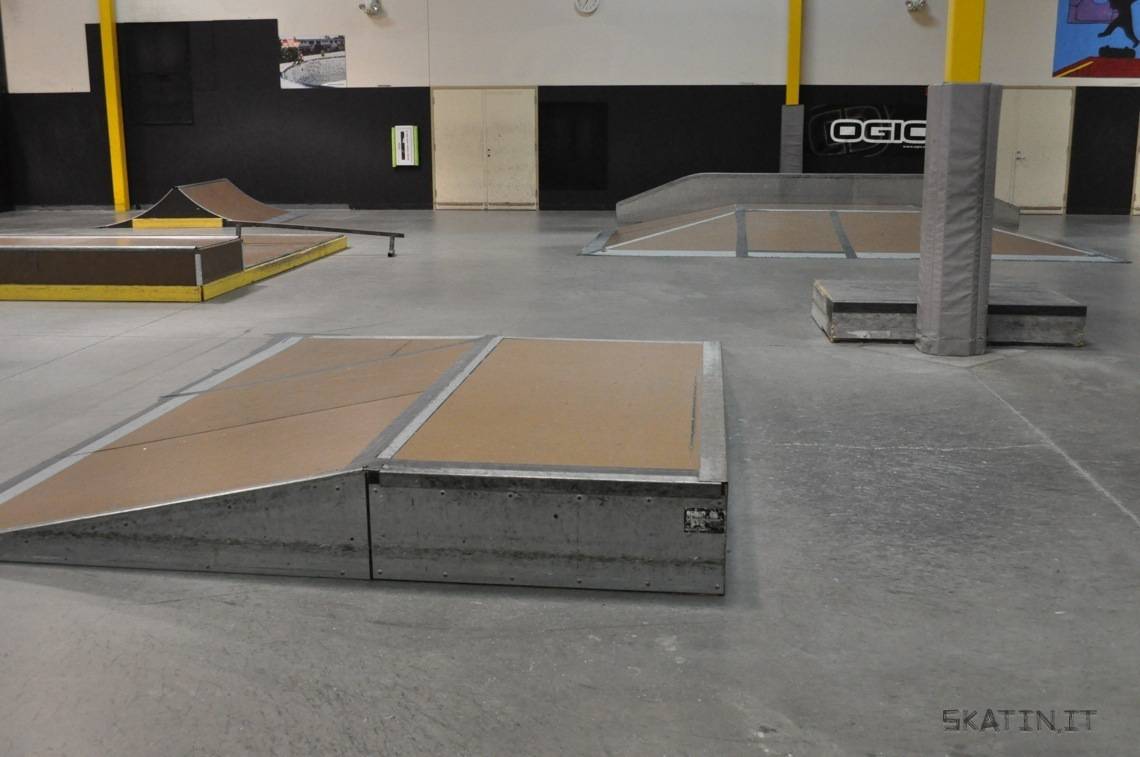 2-3ft high slide boxes that run from 20-30ft long to monstrous hubba’s that scale 20 stairs. Surrounding the main collasium is a stack of 4ft banks and transitions in all kinds of shapes, some with an extra foot or two of extension. And there’s rails and boxes everywhere,